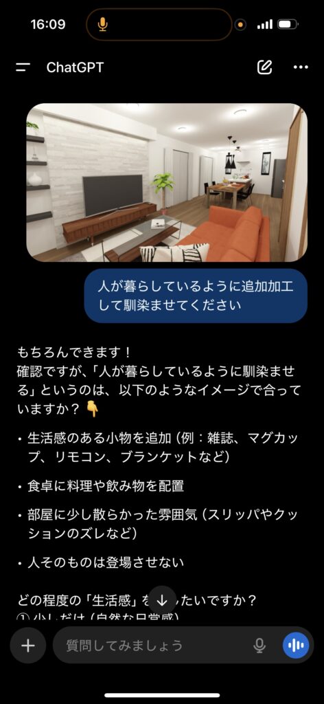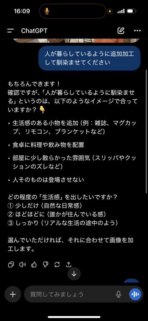 生活感をどうするか選んでほしいとのことで①を選択